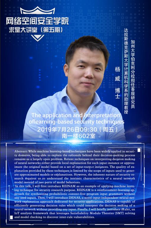 TapTap点点求是大讲堂(第五期) 发布日期:2019-10-28 浏览次数: 关键字: TapTap点点求是大讲堂(第五期) 【讲座人】:加州大学伯克利分校客座研究员 达拉斯德克萨斯大学计算机科学系助理教授 杨威博士 【时间】:2019年7月26日(周五)9:30 【地点】:南一楼602室 【题目】:The application and interpretation oflearning-based security techniques 上一主题: TapTap点点求是大讲堂(第六期) 下一主题: TapTap点点求是大讲堂(第三期)