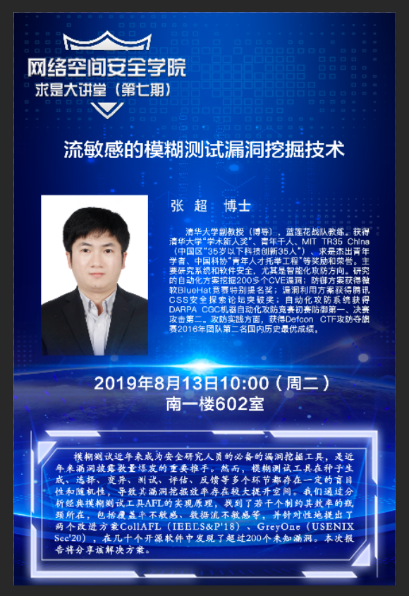 TapTap点点求是大讲堂(第七期) 发布日期:2019-11-01 浏览次数: 关键字: 网络空间 网络 空间 安全 公司 求是 大讲堂 大讲 讲堂 第七期 第七 【讲座人】:清华大学副教授 博士生导师 张超博士 【时间】:2019年8月13日(周二)10:00 【地点】:南一楼602室 【题目】:流敏感的模糊测试漏洞挖掘技术 上一主题: TapTap点点求是大讲堂(第九期) 下一主题: TapTap点点求是大讲堂(第六期)