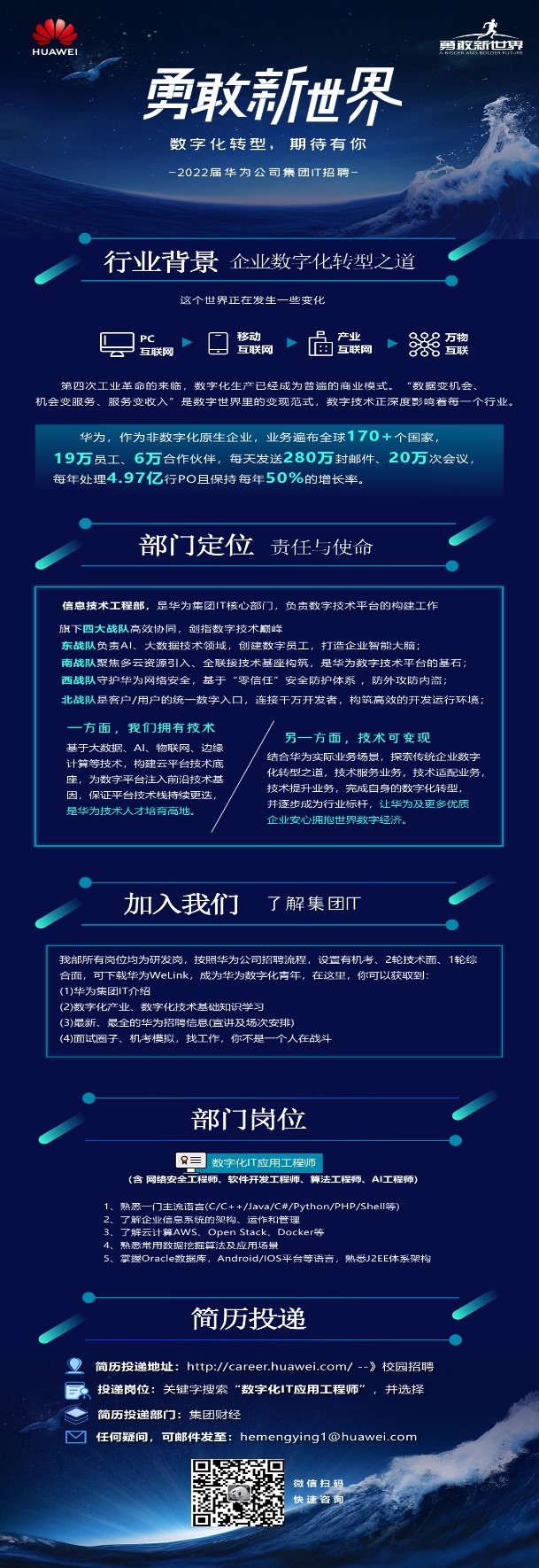 【春季招聘】华为2022届春招 发布日期:2022-04-08 浏览次数: 关键字: 春季 招聘 华为 2022 20 22 请有意向的同学,发送【姓名+集团+手机号】到邮箱:hemengying1@huawei.com 微信:15307310198 上一主题: 【实习信息】阿里巴巴春季2023届校园招聘 下一主题: 【春季招聘】环宇智行2022届春季校招